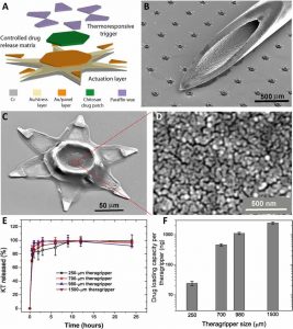 The “theragrippers” are made of metal and a thin, shape-changing film, then coated in heat-sensitive paraffin wax. The devices, each roughly the size of a dust speck, can potentially carry any drug and release it gradually into the body.