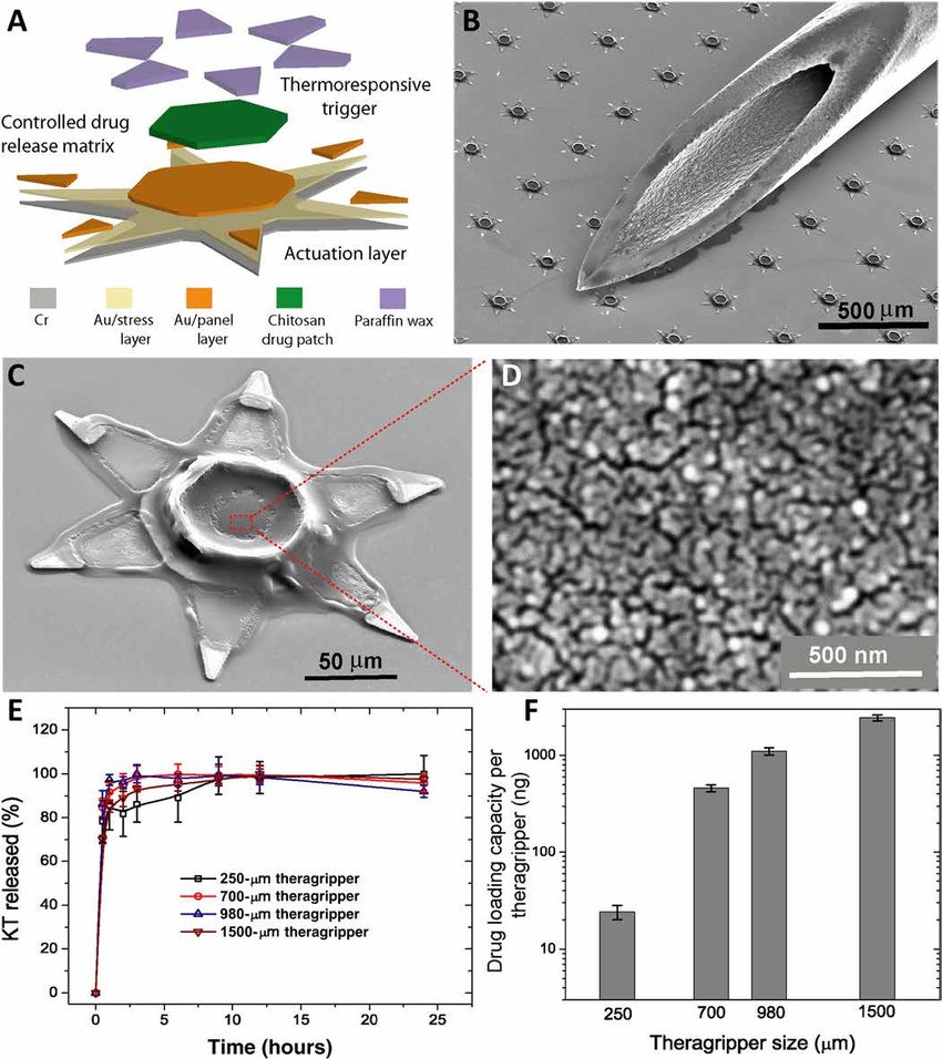 Thousands of theragrippers can be deployed in the GI tract. When the paraffin wax coating on the grippers reaches the temperature inside the body, the devices close autonomously and clamp onto the colonic wall. The closing action causes the tiny, six-pointed devices to dig into the mucosa and remain attached to the colon, where they are retained and release their medicine payloads gradually into the body. Eventually, the theragrippers lose their hold on the tissue and are cleared from the intestine via normal gastrointestinal muscular function.